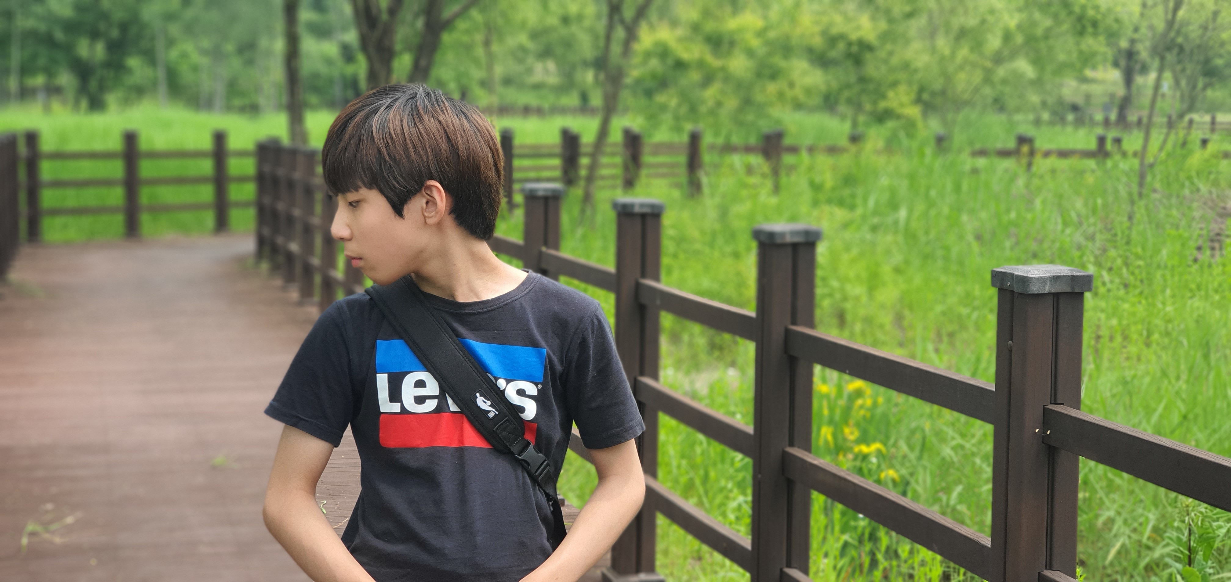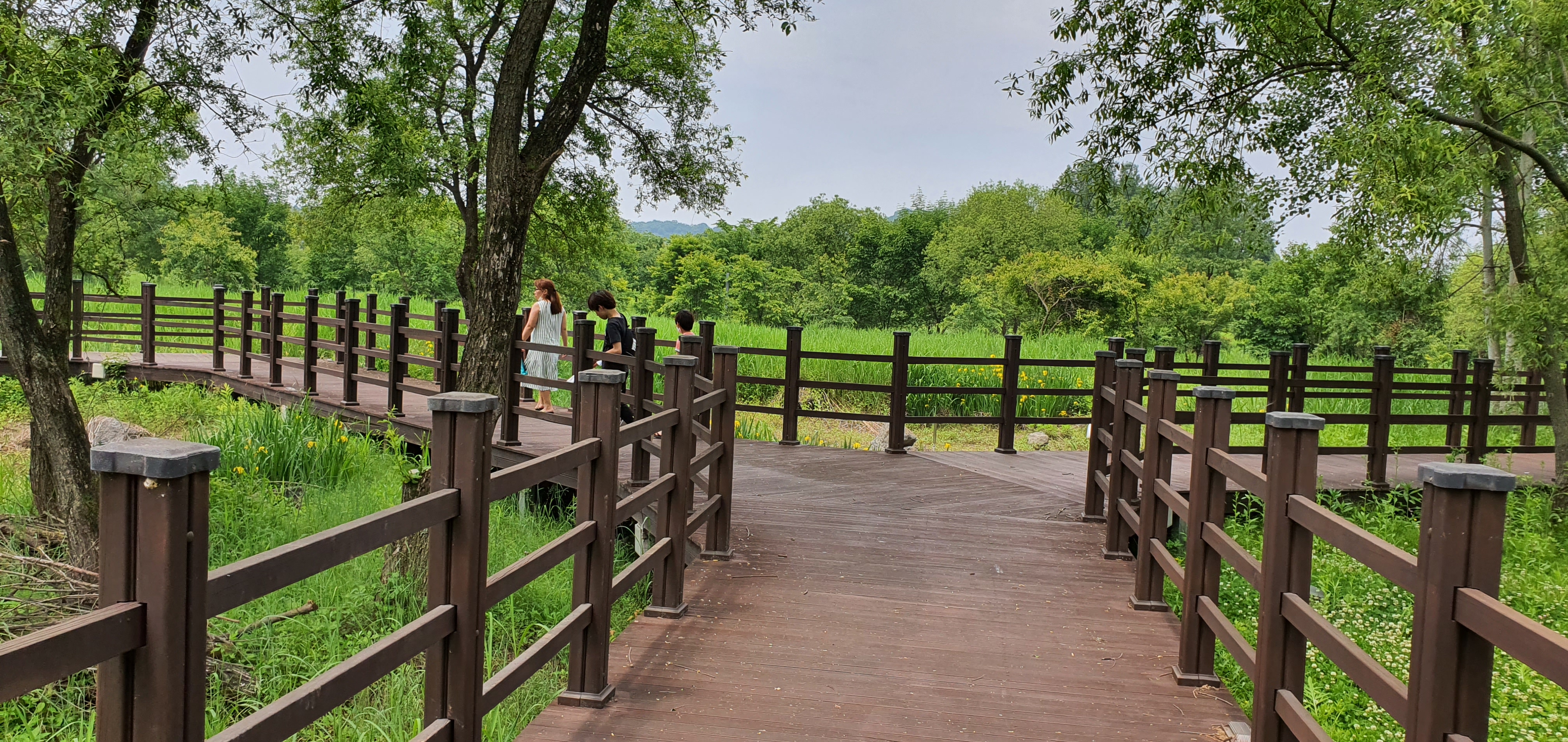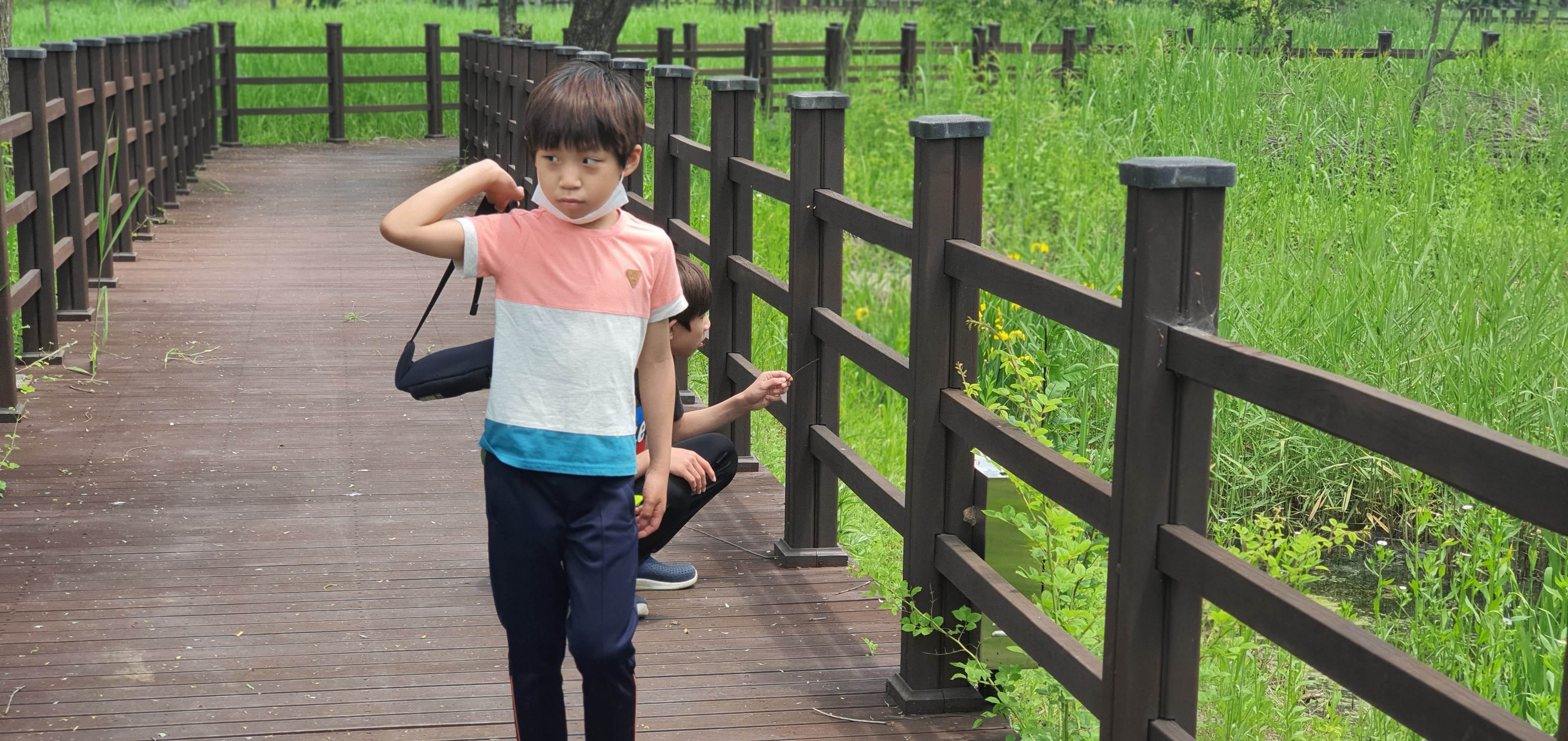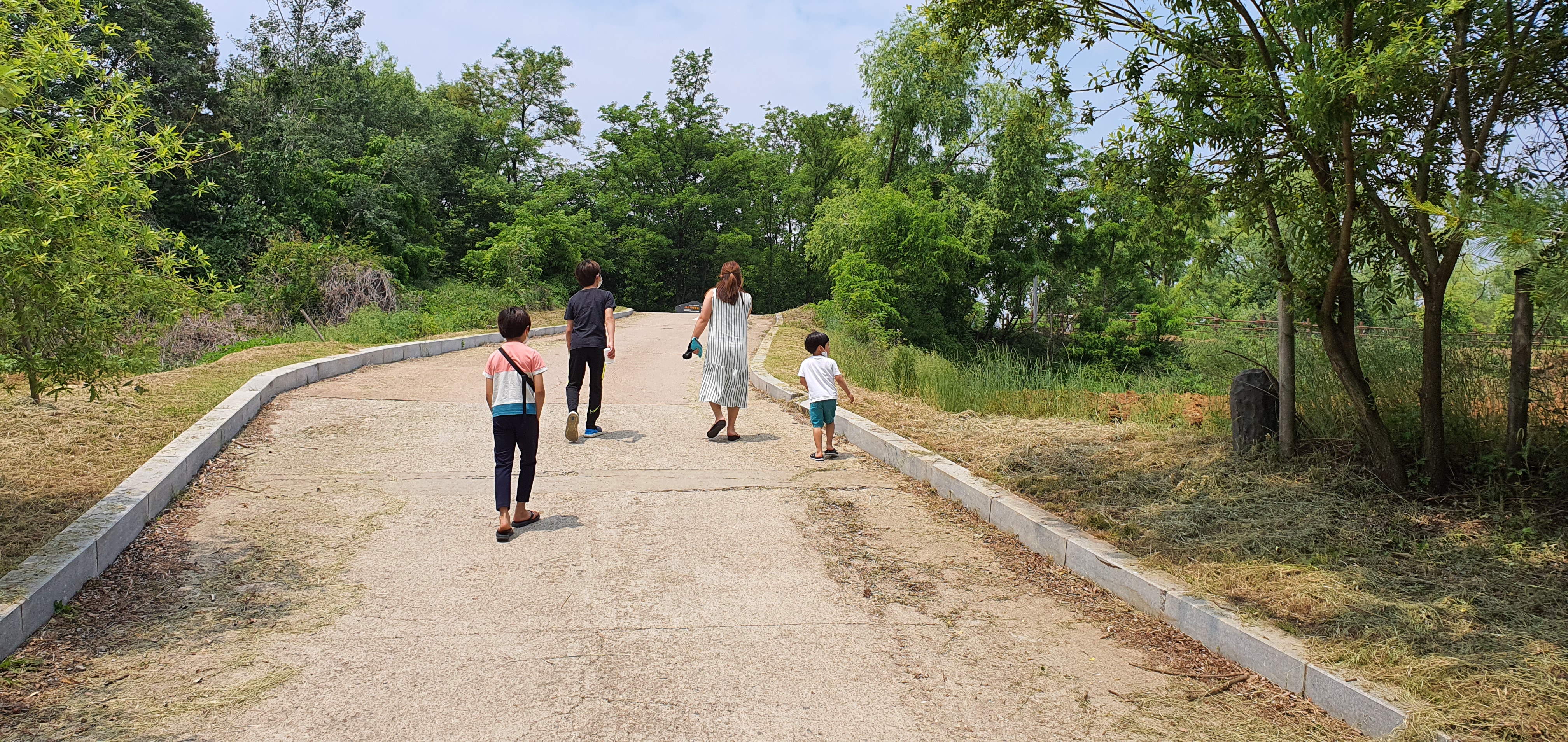 들판을 지나 멀리 보이는 오리배를 타러 갑니다.